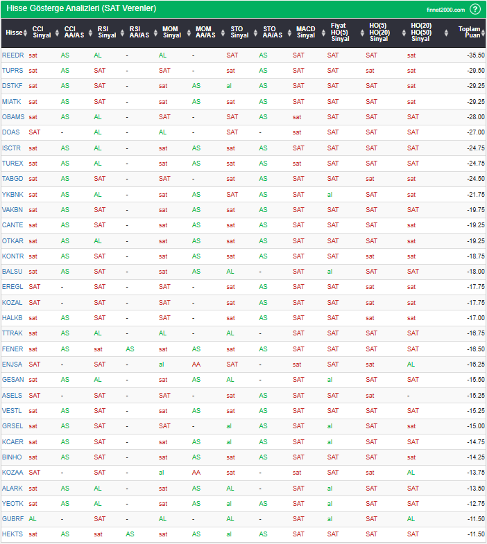 Bu çalışmada “SAT” sinyali veren hisselerin tespiti amacıyla Borsa’da işlem gören BIST 100 hisseler değerlendirmeye alınmıştır. BIST 100 üzerinde teknik analizde kullanılan 12 gösterge yöntemi ile değerleme yapılarak puanlamaya gidilerek hisseler sıralanmıştır. Ancak hisse seçiminde teknik göstergelerin tek başına kullanılması yeterli değildir. Burada ön plana çıkan hisselerin temel analizle desteklemesi ve hisseyle ilgili son haber ve bilgilerin de değerlendirilerek işlemde bulunması, daha sağlıklı sonuçlar için yararlı olacaktır.