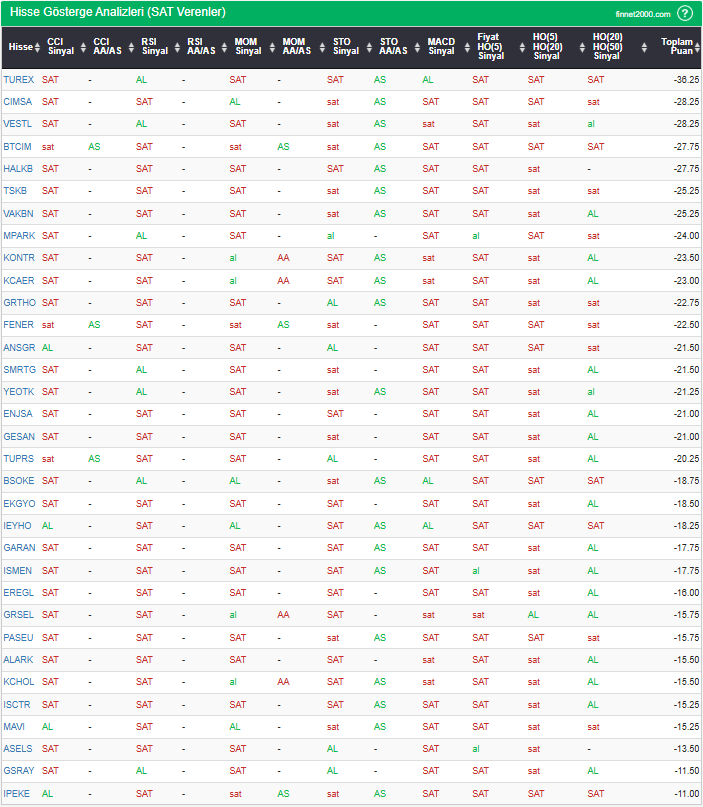 Bu çalışmada “SAT” sinyali veren hisselerin tespiti amacıyla Borsa’da işlem gören BIST 100 hisseler değerlendirmeye alınmıştır. BIST 100 üzerinde teknik analizde kullanılan 12 gösterge yöntemi ile değerleme yapılarak puanlamaya gidilerek hisseler sıralanmıştır. Ancak hisse seçiminde teknik göstergelerin tek başına kullanılması yeterli değildir. Burada ön plana çıkan hisselerin temel analizle desteklemesi ve hisseyle ilgili son haber ve bilgilerin de değerlendirilerek işlemde bulunması, daha sağlıklı sonuçlar için yararlı olacaktır.