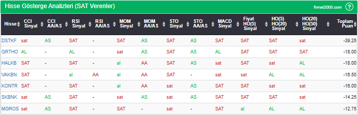 Bu çalışmada “SAT” sinyali veren hisselerin tespiti amacıyla Borsa’da işlem gören BIST 100 hisseler değerlendirmeye alınmıştır. BIST 100 üzerinde teknik analizde kullanılan 12 gösterge yöntemi ile değerleme yapılarak puanlamaya gidilerek hisseler sıralanmıştır. Ancak hisse seçiminde teknik göstergelerin tek başına kullanılması yeterli değildir. Burada ön plana çıkan hisselerin temel analizle desteklemesi ve hisseyle ilgili son haber ve bilgilerin de değerlendirilerek işlemde bulunması, daha sağlıklı sonuçlar için yararlı olacaktır.