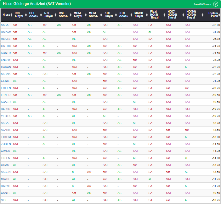 Bu çalışmada “SAT” sinyali veren hisselerin tespiti amacıyla Borsa’da işlem gören BIST 100 hisseler değerlendirmeye alınmıştır. BIST 100 üzerinde teknik analizde kullanılan 12 gösterge yöntemi ile değerleme yapılarak puanlamaya gidilerek hisseler sıralanmıştır. Ancak hisse seçiminde teknik göstergelerin tek başına kullanılması yeterli değildir. Burada ön plana çıkan hisselerin temel analizle desteklemesi ve hisseyle ilgili son haber ve bilgilerin de değerlendirilerek işlemde bulunması, daha sağlıklı sonuçlar için yararlı olacaktır.