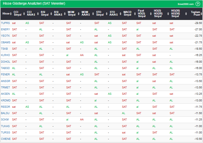 Bu çalışmada “SAT” sinyali veren hisselerin tespiti amacıyla Borsa’da işlem gören BIST 100 hisseler değerlendirmeye alınmıştır. BIST 100 üzerinde teknik analizde kullanılan 12 gösterge yöntemi ile değerleme yapılarak puanlamaya gidilerek hisseler sıralanmıştır. Ancak hisse seçiminde teknik göstergelerin tek başına kullanılması yeterli değildir. Burada ön plana çıkan hisselerin temel analizle desteklemesi ve hisseyle ilgili son haber ve bilgilerin de değerlendirilerek işlemde bulunması, daha sağlıklı sonuçlar için yararlı olacaktır.