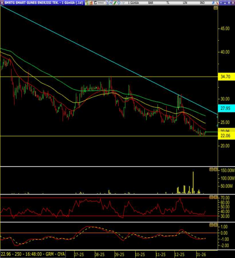 Hacim tarafında dip bölgede artan hacim dikkat çekse de henüz net trend dönüşünü teyit etmiyor. MACD negatif bölgede. Özetle, 22,00 TL’nin altındaki kapanışlar düşüşü hızlandırabilir, 27,95 üzeri kalıcılık sağlanmadan trend dönüşünden bahsetmek zor.