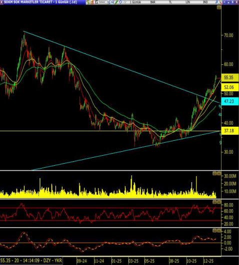 Mevcut fiyat düşen ana trend çizgisine oldukça yakın olduğu için kritik direnç konumunda. Bu bölge, geçmişte satışların yoğunlaştığı alanlarla örtüşüyor. Yukarı yönlü hareketin kalıcı bir trend dönüşü olabilmesi için 55 –56 bandının hacimli ve kapanış bazlı aşılması gerekiyor.
