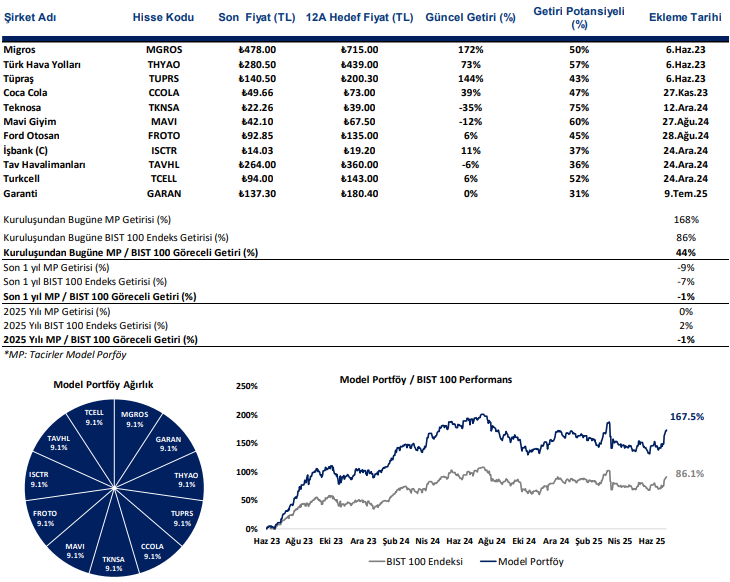 2025 2. Yarı Görünüm raporumuzla beraber Model Portöyümüzde de revizyona gidiyor ve Yapı Kredi Bankası’nı çıkartırken yerine Garanti Bankası’nı ekliyoruz. Ek olarak, Model Portföy’ümüze eklediğimiz Şubat ayından bu yana endeks göreceli %65 getiri sağlayan Aselsan’ı da portföyden çıkartıyoruz. Türk Hava Yolları, Coca Cola İçecek, Ford Otomotiv, Mavi Giyim, Migros, Teknosa, TAV Havalimanları, Turkcell ve Tüpraş ise Model Portföyümüzde kalmaya devam ediyorlar.