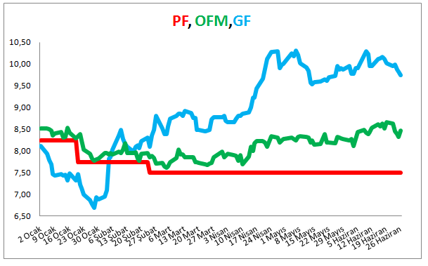 Aşağıdaki grafik TCMB politika faizi (kırmızı, PF), TCMB ortalama fonlama maliyeti (yeşil, OFM) ve gösterge faizin (mavi, GF) yılbaşından bu yana hareketlerini gösteriyor. Grafiğe bakacak olursak son dönemde kurlarda ortaya çıkan yumuşama nedeniyle gösterge faizde görülen düşüş durumu biraz toparlamış görünse gösterge faizin halen politika faizinden de ağırlıklı ortalama fonlama maliyetinden de uzak olduğu görülüyor.