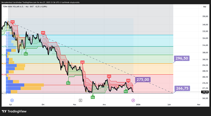 THYAO hisse grafiğinde kritik bir kırılma noktasındayız ve teknik yapı oldukça zayıf görünüyor. Eylül-Ekim zirvesinden bu yana süregelen düşüş trendi (kesikli çizgi) baskın durumda ve fiyat bu trendin oldukça altında seyrediyor. 266-268 TL bandında gezinen mevcut seviye, aslında son toparlanma hareketinin tükendiği ve satış baskısının yeniden devreye girdiği bir bölge.