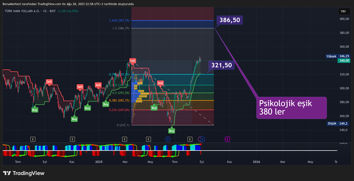Fibonacci pivot desteği 288 TL civarında, ikinci destek ise 316 TL seviyesinde. Yukarıda ilk direnç 341 TL, ikinci direnç ise 360 TL civarında takip edilebilir. Genel olarak THYAO’da teknikler alım yönünde olsa da, kâr büyümesindeki zayıflık soru işareti. Fib için 380 sonrası yeni bir boyut yaşanabilir.