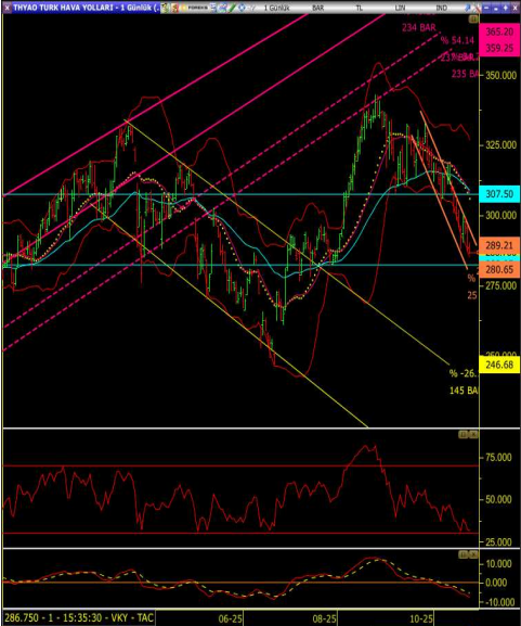 • Geri çekilmelerin devamında bollinger alt banda karşılık gelen 285.00 destek seviyesinde mevcut pozisyonlar korunabilir.