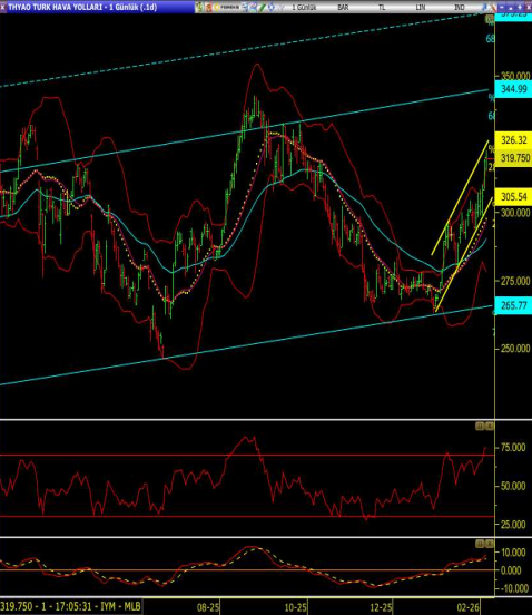 Olası geri çekilmelerin oluşumu halinde bollinger üst banda karşılık gelen 317.00 üzerinde mevcut pozisyonlar korunabilir. Bu seviyenin altında kanal içerisinde satış baskısı artabilir.