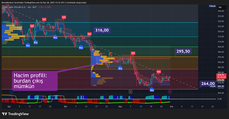 Volatilite göstergeleri hissenin oldukça hareketli bir yapıya sahip olduğunu ortaya koyuyor. Günlük işlem hacmi 21,4 milyon lot seviyesinde gerçekleşirken, hacimde aylık bazda %16,53 düşüş gözlemleniyor. Şirket yıllık %2,45 temettü verimi sunuyor ve pivot noktaları 298 TL seviyesini işaret ediyor. Williams yüzde aralığı -39,66 ile aşırı satım bölgesine yaklaşmış durumda. 27 Ağustos’tan itibaren süpertrend sat sinyalleri verdi. Fakat momentum güç kazanırsa katkı sağlayabilir.