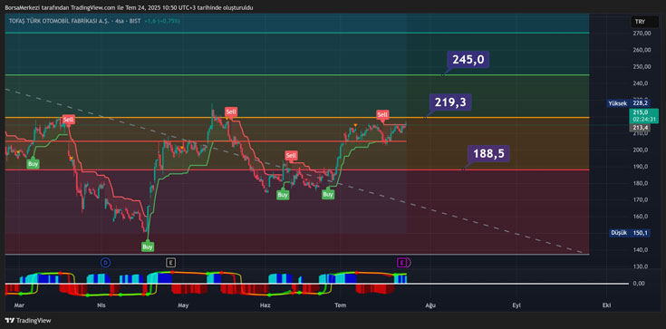 Ayrıca, grafikte belirtilen önemli seviyeler (188,5 TL ve 219,3 TL) fiyat hareketlerinde önemli destek ve eşik noktaları olarak değerlendirilmelidir. Bu seviyelerden yapılan kırılmalar, gelecekteki fiyat hareketlerine önemli etkiler verebilir.