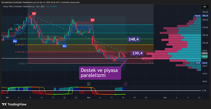 TOASO hissesi 232,4 TL seviyesinde işlem görüyor ve son dönemde güçlü bir düşüş trendi içinde. Fibonacci seviyelerine bakıldığında, 0,786 düzeltme seviyesi 273 TL civarında, 0,618 seviyesi 263 TL’de ve 0,5 seviyesi 255 TL’de konumlanmış. Hisse şu anda 0,382 seviyesi olan 248 TL’nin altında işlem görüyor. Grafikte belirgin bir destek ve piyasa paralelizmi işareti mevcut ve fiyat önemli bir kırılma noktasında.