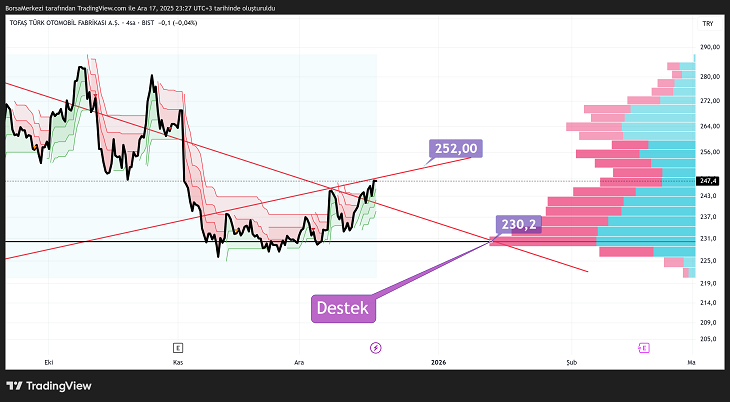Grafik üzerinde kritik seviyeler net olarak görülüyor. 237.05-241.98 TL arası güçlü destek bandı (Ichimoku + Fibonacci), bu bölge korunduğu sürece yapı yükseliş yanlısı. 230.2 TL ise son savunma çizgisi, burası kırılırsa 220-225 TL bandına kadar düşüş görülebilir. Direnç tarafında 252 TL kırılması kritik, bu seviye aşılırsa 260-265 TL hedeflenebilir, sonrasında 275-280 TL bandı gelebilir.