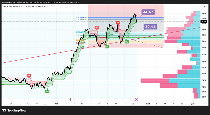 Teknik rating “Buy” seviyesinde olmasına rağmen, Moving Averages Rating “Güçlü Al” konumunda. Bu çelişki oldukça bilgilendirici: fiyat hareketli ortalamaların çok üzerinde seyrettiği için MA’lar güçlü alım sinyali verirken, osilatörlerin nötr durumu genel rating’i sadece “Al” seviyesine çekiyor. 40.56 TRY önemli bir destek seviyesi olarak izlenmeli.