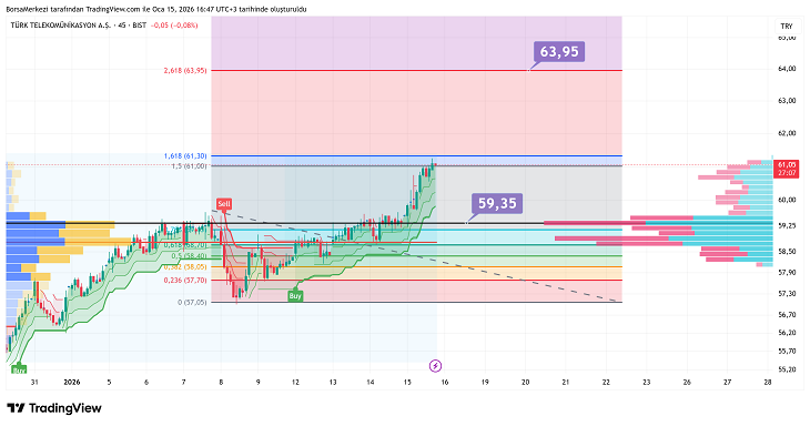 Direnç tarafında ise hissenin kısa vadede test edeceği ilk hedef 63,95 TRY seviyesi öne çıkıyor – bu seviye grafik üzerinde belirgin bir direnç bölgesi oluşturuyor. İkinci kritik direnç ise 64,00 TRY psikolojik barajı olarak karşımıza çıkıyor.