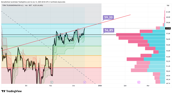 Direnç seviyesi olarak 59,20 TL öne çıkıyor. Bu noktada fiyat daha önce tutunamamış ve geri çekilmiş. Hacim profilinde bu seviyenin üzerinde daha ince çubuklar var, yani satış baskısı arttıkça likidite azalıyor. 61 TL hedefi için önce 59,20 TL’nin kırılması ve ardından bu seviyenin destek olarak onaylanması gerekiyor. Bu kırılım gerçekleşirse, hızlı bir yükseliş momentum kazanabilir.