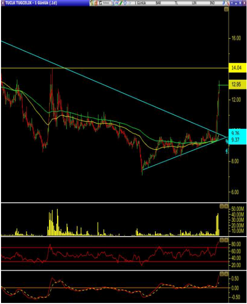 • Uzun vadeli düşen trend içerisinde hareket eden hisse, aldığı destek ile trendi güçlü hacimle aşmış durumda.