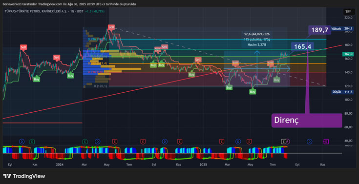 TUPRS (Tüpraş), teknik göstergelere göre “Al” sinyali veriyor. Teknik notu “Al”, hareketli ortalamalar ise “Güçlü Al” seviyesinde. RSI 63,6 ile pozitif bölgede, momentum ise 1,9 ile sınırlı yukarı yönlü. Awesome Oscillator 13 seviyelerinde, CCI 58,4 ile güçlü. Bir bakalım indikatörlere derinden. Stokastik %K ve %D değerleri sırasıyla 73,9 ve 75,8 olup aşırı alım bölgesine yakın.