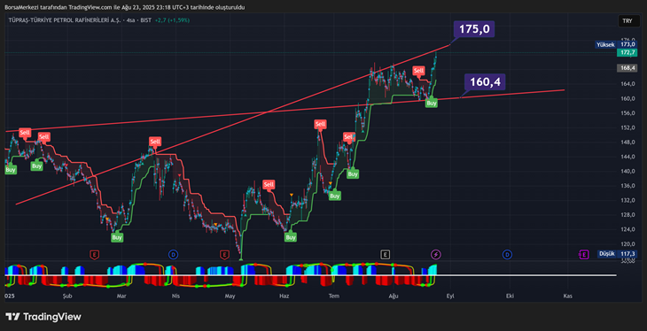 Teknik olarak Fibonacci pivot noktası 159.8 TL seviyesinde. Kısa vadeli destekler 164.5 TL ve 159.8 TL; direnç seviyeleri ise 172.7 TL ve 177 TL civarında öne çıkıyor. Bu bant içinde fiyat hareketi kısa vadeli yönü belirleyecek. Süpertrendden Al sinyali alındı ve temettüler dağıtılırken Tüpraş kendini Ultra macd ile de hatırlattı.