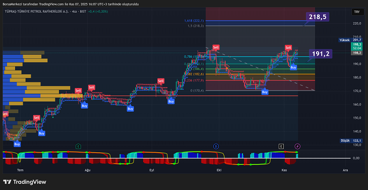 Fiyat tarafında hisse 198,2 TL seviyesinde. Haftalık performans yüzde +1,2, aylık yüzde +9,6. Fibonacci pivot 189,2 TL’de, Ichimoku Base Line ise 185,9 TL seviyesinde, bu da destek görünümünü güçlendiriyor.