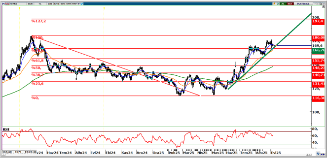 166.50 üzerinde oluşan her gerilemeyi teknik düzeltme olarak okuyarak kısa vadede 170.70 ve 180.00 ara dirençlerini izlemeyi sürdüreceğiz. Gelişmelere bağlı olarak biraz daha orta vadeli bir yapıda 197.40 seviyesi de hedef olarak kalmaya devam ediyor. 166.50 desteğinin aşağısında kapanışlarda zarar kes uygulanması gerektiğini düşünüyoruz.
