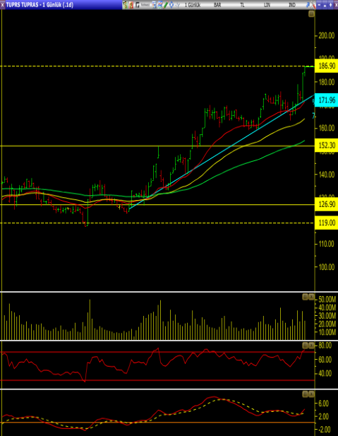 • 126.90 seviyesinden aldığı destek ile yükselen hissenin 186.90 seviyesini test ettiğini görüyoruz.