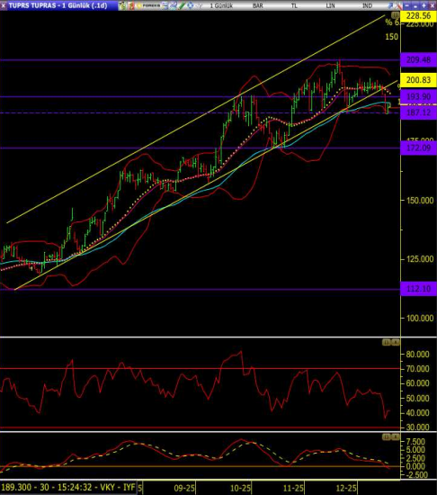 Olası tepki alımlarının satışları karşılaması halinde teyidi için ise ilk olarak 50 günlük ortalaması 191.30 seviyesinin üzerinde kapanışlar görmeliyiz.