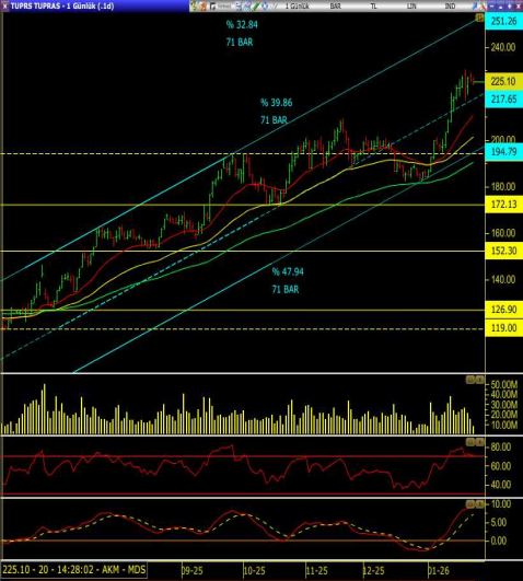 Genel görünüm; 217-194 bandının üzerinde kalındığı sürece pozitif. Kısa-orta vadeli göstergelerin aşağı yönlü hareketi karşısında ise, düzeltme hareketleri görülebilir ancak MACD, sinyal çizgisi üzerinde AL veriyor olmasına karşın orta vadede olumlu bir görüntü var.