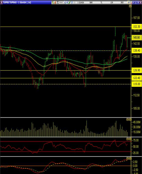 • Hisse, bir süredir hareket ettiği yatay bandı aşarak, önemli bir direnç olan 138.40 seviyesi üzerinde ilerliyor.