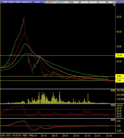 Hisse 6.95 civarında dip oluşturmuş, 9,89 TL seviyesi ise kritik direnç olarak karşımıza çıkıyor; bu seviyenin aşılması ile hissede yükseliş desteklenecektir. Eğilim dönüşü için net sinyaller yani bu hacim artışı, MACD pozitif kesişim ve hareketli ortalamaları yukarı kırması, beklenmelidir.