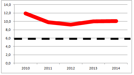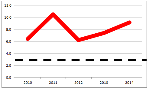 Gerçekleşen cari açık, ideal cari açık oranından oldukça yukarıda duruyor. Son iki yılda cari açığı düşürücü önlemler alınmış, büyümeden ciddi anlamda fedakârlık edilmiş olmasına karşın cari açık yüzde 5’e yaklaşmış değil. Kaldı ki yüzde 5 bile çok yüksek bir oran. Türkiye ekonomisi için ideal cari açık oranı, ekonominin dışa daha fazla açıldığı dikkate alınarak, geçmiş yıllar ortalamasının (yüzde 2) biraz üzerine çıkılarak yüzde 3 – 3,5 olarak kabul edilebilir (grafikteki kesikli siyah çizgi). Cari açık oranımız 2014’de ideal çizgiye yaklaşmış olsa da hala yüksel bir düzeyde bulunuyor.