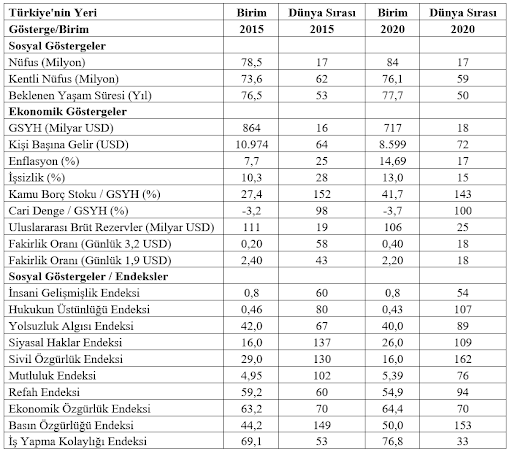 Aşağıdaki tablo; Türkiye’nin dünyadaki sosyal, siyasal ve ekonomik yerine ilişkin gösterge ve endeksleri bir araya getiren ve aynı gösterge ve endeksleri 2015 yılındaki durumla karşılaştırıyor (Kaynak: https://knoema.com/atlas. Bu site yayımladığı verileri IMF’nin World Economic Outlook April 2021 Database setinden alıyor. İkisi arasında fark olduğu hallerde IMF verisi esas alınmıştır. Endeksler içinde yalnızca Yolsuzluk Algı Endeksi ‘en düşük puan en iyi’, diğerleri ‘en yüksek puan en iyi’ olarak düşünülmelidir.)