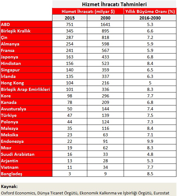 Rapora göre; Türkiye’nin 2030’da en çok hizmet ihraç edeceği ülkelerin sırasıyla Almanya, Çin, Birleşik Krallık, Hindistan ve Birleşik Arap Emirlikleri’nin olacağı tahmin ediliyor.