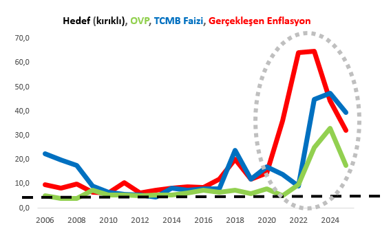 Tablo, enflasyon hedefinden, OVP’lerdeki tahminlerden sapmaların yüksekliğini ve TCMB politika faizinin hedefe veya OVP tahminlerini yakalamak konusunda ne kadar yetersiz kaldığını net bir biçimde ortaya koymakla birlikte, durumu daha iyi gösterebilmek için bu verileri bir grafiğe taşıyalım: