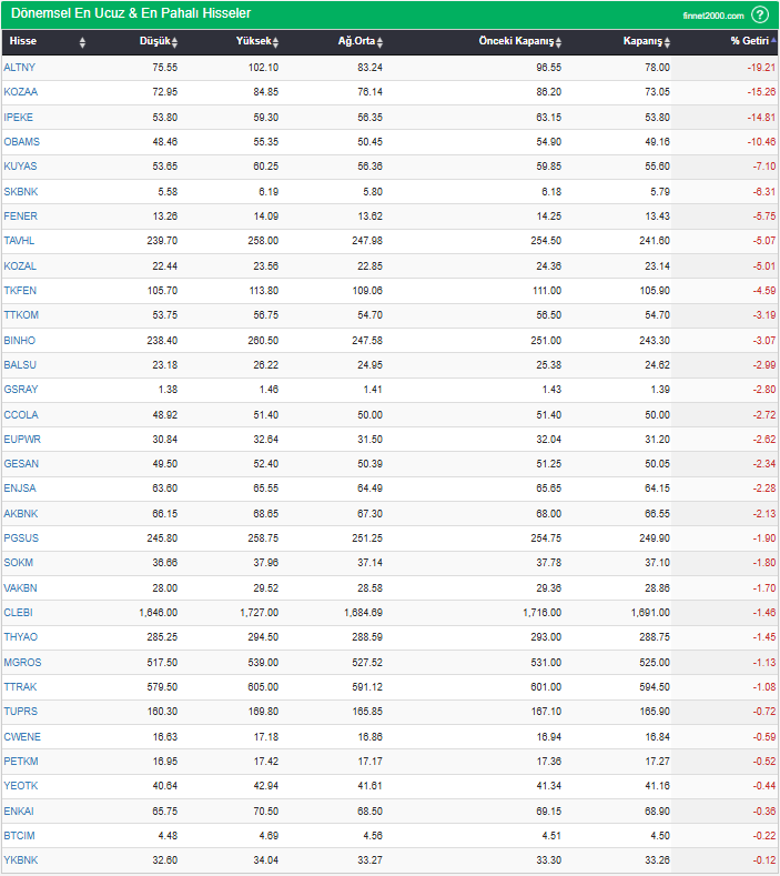 Hisse senedinin seçilen baza göre bağıl getirisinin gösterildiği tablodur. “Ucuz hisseler” tablosunda seçilen baza göre bağıl getirisi negatif olanlar görüntülenir. Baz getiriye göre ucuz ve pahalı hisselerin listelenmesi, hem endeks bazında hem de sektör bazında hızlı hareket eden yada yavaş hareket hisseleri görebilmenizi sağlar.