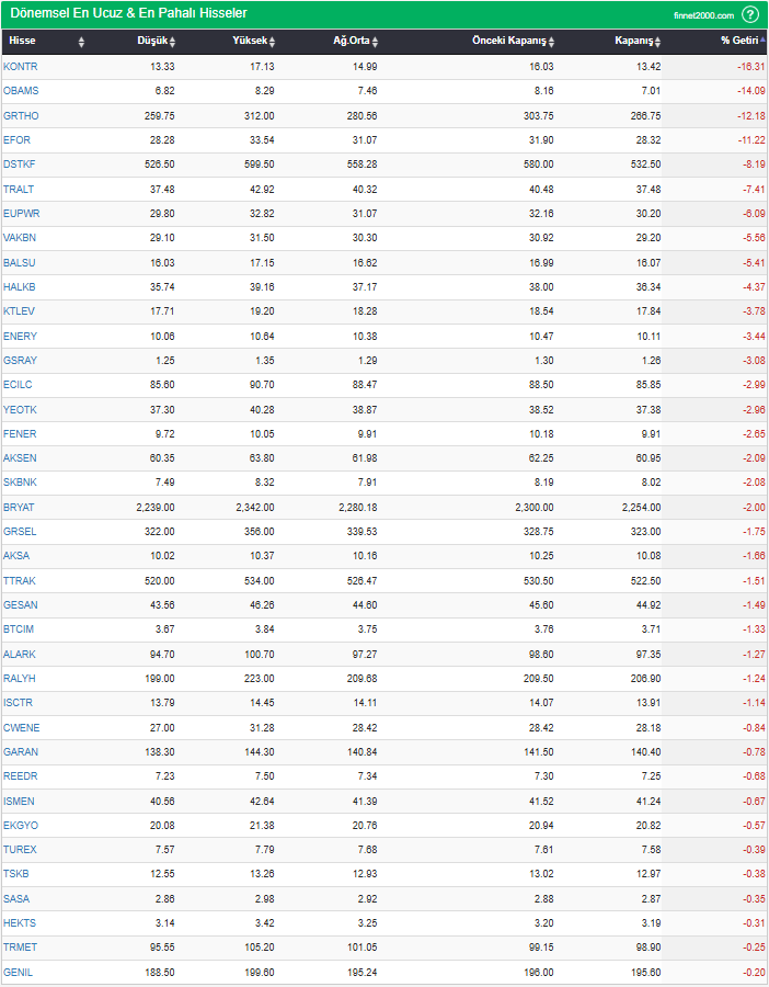 Hisse senedinin seçilen baza göre bağıl getirisinin gösterildiği tablodur. “Ucuz hisseler” tablosunda seçilen baza göre bağıl getirisi negatif olanlar görüntülenir. Baz getiriye göre ucuz ve pahalı hisselerin listelenmesi, hem endeks bazında hem de sektör bazında hızlı hareket eden yada yavaş hareket hisseleri görebilmenizi sağlar.