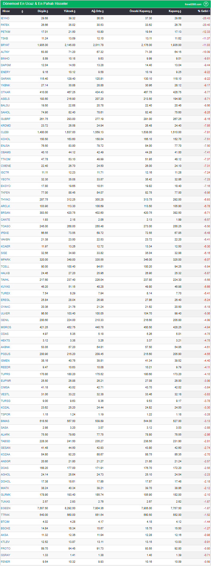 Hisse senedinin seçilen baza göre bağıl getirisinin gösterildiği tablodur. “Ucuz hisseler” tablosunda seçilen baza göre bağıl getirisi negatif olanlar görüntülenir. Baz getiriye göre ucuz ve pahalı hisselerin listelenmesi, hem endeks bazında hem de sektör bazında hızlı hareket eden yada yavaş hareket hisseleri görebilmenizi sağlar.