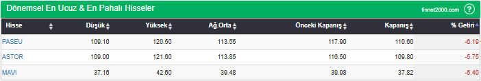 Hisse senedinin seçilen baza göre bağıl getirisinin gösterildiği tablodur. “Ucuz hisseler” tablosunda seçilen baza göre bağıl getirisi negatif olanlar görüntülenir. Baz getiriye göre ucuz ve pahalı hisselerin listelenmesi, hem endeks bazında hem de sektör bazında hızlı hareket eden yada yavaş hareket hisseleri görebilmenizi sağlar.