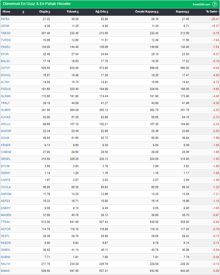 Hisse senedinin seçilen baza göre bağıl getirisinin gösterildiği tablodur. “Ucuz hisseler” tablosunda seçilen baza göre bağıl getirisi negatif olanlar görüntülenir. Baz getiriye göre ucuz ve pahalı hisselerin listelenmesi, hem endeks bazında hem de sektör bazında hızlı hareket eden yada yavaş hareket hisseleri görebilmenizi sağlar.
