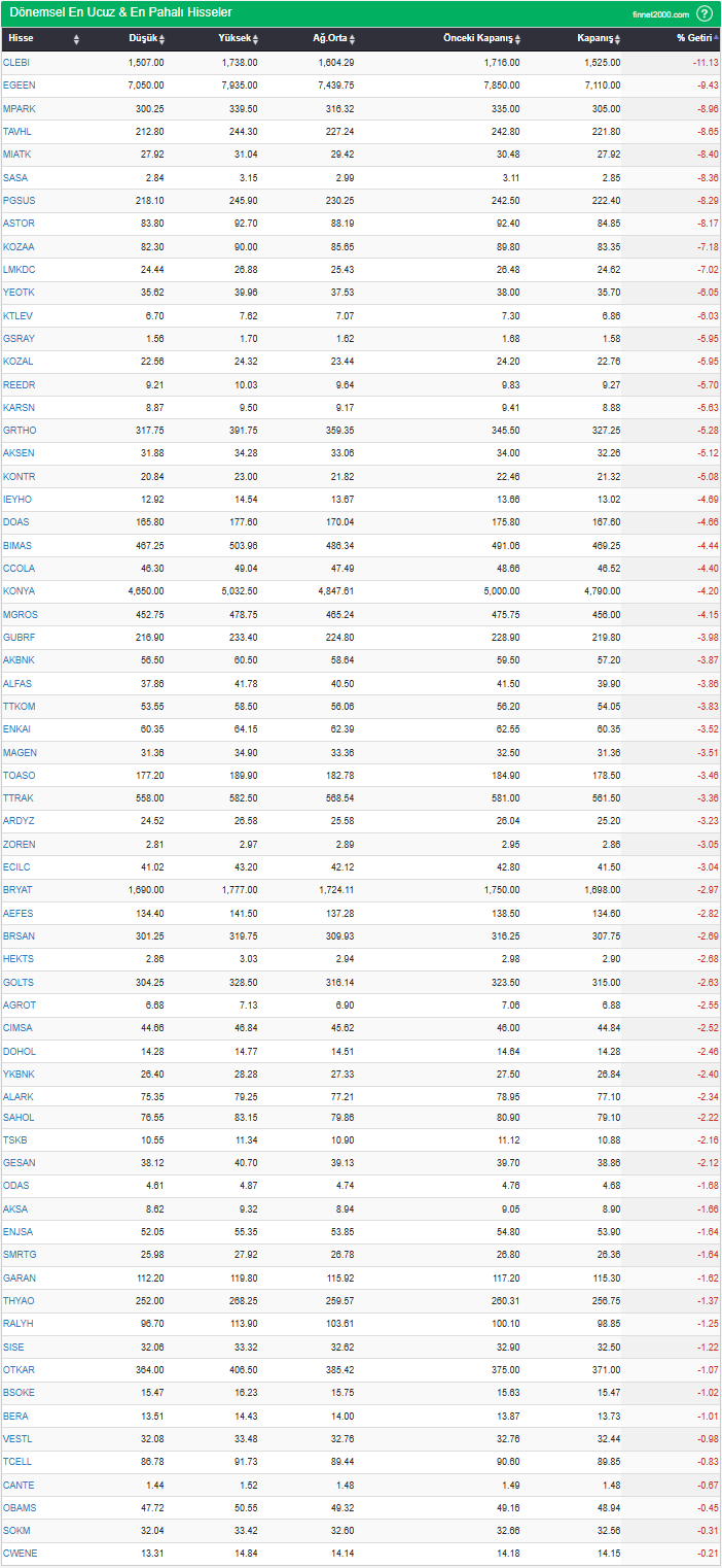 Hisse senedinin seçilen baza göre bağıl getirisinin gösterildiği tablodur. “Ucuz hisseler” tablosunda seçilen baza göre bağıl getirisi negatif olanlar görüntülenir. Baz getiriye göre ucuz ve pahalı hisselerin listelenmesi, hem endeks bazında hem de sektör bazında hızlı hareket eden yada yavaş hareket hisseleri görebilmenizi sağlar.