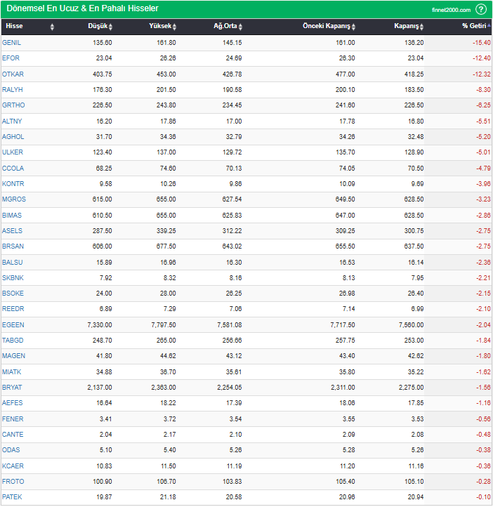 Hisse senedinin seçilen baza göre bağıl getirisinin gösterildiği tablodur. “Ucuz hisseler” tablosunda seçilen baza göre bağıl getirisi negatif olanlar görüntülenir. Baz getiriye göre ucuz ve pahalı hisselerin listelenmesi, hem endeks bazında hem de sektör bazında hızlı hareket eden yada yavaş hareket hisseleri görebilmenizi sağlar.