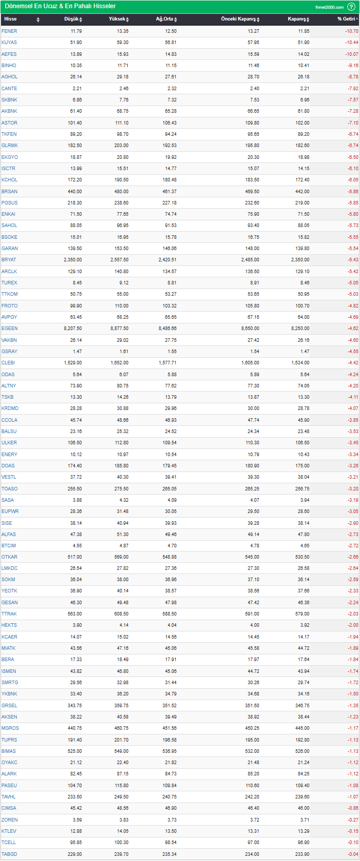 Hisse senedinin seçilen baza göre bağıl getirisinin gösterildiği tablodur. “Ucuz hisseler” tablosunda seçilen baza göre bağıl getirisi negatif olanlar görüntülenir. Baz getiriye göre ucuz ve pahalı hisselerin listelenmesi, hem endeks bazında hem de sektör bazında hızlı hareket eden yada yavaş hareket hisseleri görebilmenizi sağlar.
