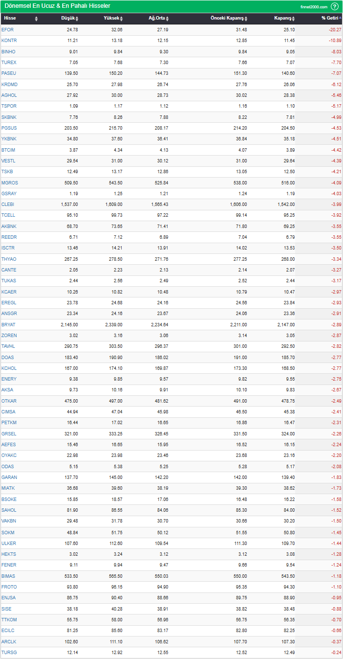 Hisse senedinin seçilen baza göre bağıl getirisinin gösterildiği tablodur. “Ucuz hisseler” tablosunda seçilen baza göre bağıl getirisi negatif olanlar görüntülenir. Baz getiriye göre ucuz ve pahalı hisselerin listelenmesi, hem endeks bazında hem de sektör bazında hızlı hareket eden yada yavaş hareket hisseleri görebilmenizi sağlar.