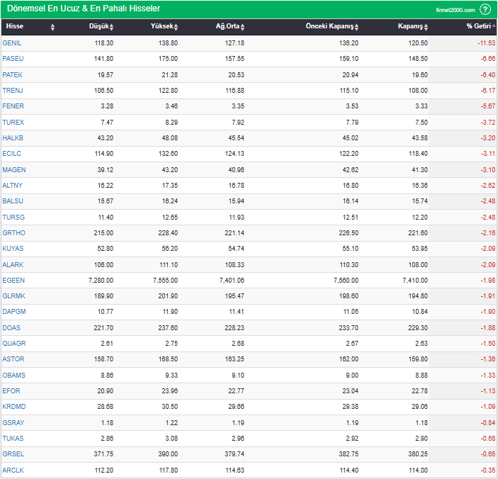 Hisse senedinin seçilen baza göre bağıl getirisinin gösterildiği tablodur. “Ucuz hisseler” tablosunda seçilen baza göre bağıl getirisi negatif olanlar görüntülenir. Baz getiriye göre ucuz ve pahalı hisselerin listelenmesi, hem endeks bazında hem de sektör bazında hızlı hareket eden yada yavaş hareket hisseleri görebilmenizi sağlar.