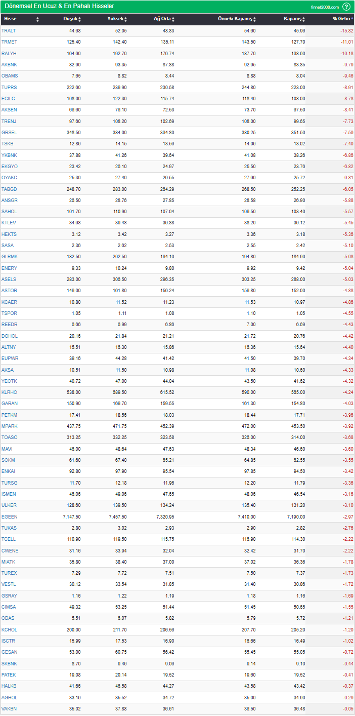 Hisse senedinin seçilen baza göre bağıl getirisinin gösterildiği tablodur. “Ucuz hisseler” tablosunda seçilen baza göre bağıl getirisi negatif olanlar görüntülenir. Baz getiriye göre ucuz ve pahalı hisselerin listelenmesi, hem endeks bazında hem de sektör bazında hızlı hareket eden yada yavaş hareket hisseleri görebilmenizi sağlar.