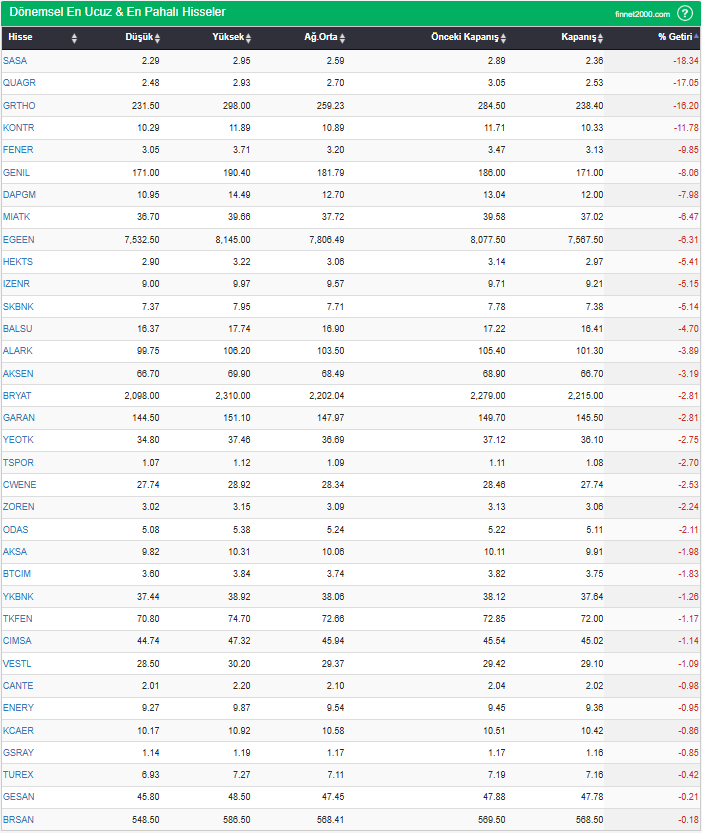 Hisse senedinin seçilen baza göre bağıl getirisinin gösterildiği tablodur. “Ucuz hisseler” tablosunda seçilen baza göre bağıl getirisi negatif olanlar görüntülenir. Baz getiriye göre ucuz ve pahalı hisselerin listelenmesi, hem endeks bazında hem de sektör bazında hızlı hareket eden yada yavaş hareket hisseleri görebilmenizi sağlar.