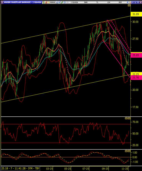 • Tepki alımlarının devamında düşen kanalın üst bandını yukarı yönlü kıracağından alımlar ivmelenerek ilk etapta bollinger üst banda karşılık gelen 25.52 seviyesine hızlanabilir.