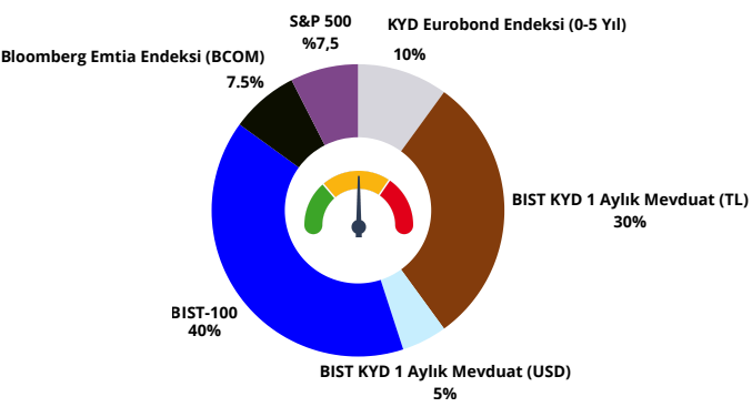 Benchmark dağılımında %40 ağırlıkla BIST 100 Endeksi kullanılarak, Türkiye hisse senedi piyasasının genel performansı temel referans noktası olarak alınmıştır. Kısa vadeli ve düşük riskli TL varlıkları temsil etmesi amacıyla %30 BIST KYD 1 Aylık Mevduat TL Endeksi benchmarka dahil edilirken, döviz cinsi likit enstrümanları temsilen %5 BIST KYD 1 Aylık Mevduat USD Endeksi kullanılmıştır.