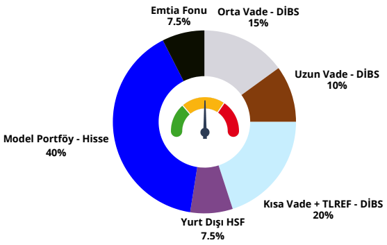 Varlık dağılımımızda; Gedik Yatırım Araştırma ekibinin hazırladığı hisse model portföyünün ağırlığı %40 olarak belirlenirken, kısa–orta–uzun vadeli DİBS ve TLREF’e endeksli enstrümanlarla toplam %45 ağırlıkla sabit getirili yapı güçlendirilmekte; emtia/kıymetli madenler (%7,5) ve yurt dışı hisse senedi ve yabancı varlıkları içeren fonlar (%7,5) ile daha dengeli ve çeşitlendirilmiş bir portföy kompozisyonu oluşturulmaktadır.
