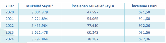 2024 yılında faal gelir ve kurumlar vergisi mükellefi sayısı 3.797.864 kişi. Vergi müfettişleri bunların 78.187’sini (yüzde 2,06) incelemeye tabi tutmuş. Çeşitli ülkelere ilişkin çalışmalar vergi mükelleflerinin yüzde 2 – 3 oranındaki bölümünün vergi incelemesine tabi tutulmasının normal olduğunu gösteriyor. Bu durumda vergi müfettişlerinin inceleme yaptığı mükelleflerin toplam mükellef sayısına oranı dünya uygulamasına uygun görünüyor.